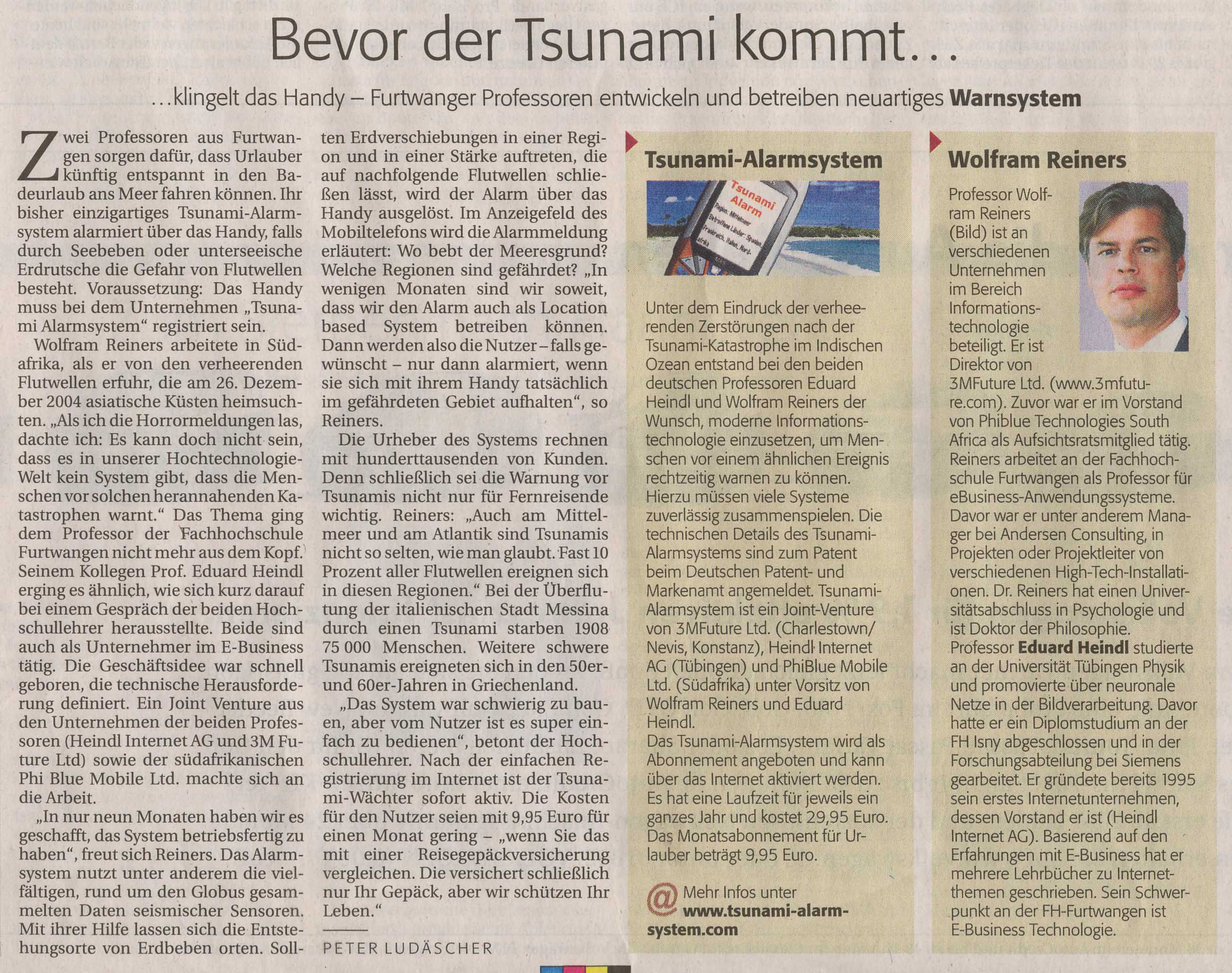 About Reiners in the Media (a selection of highlights) Media reports about the National Outright Speed Sailing Record Germany are here >> BusinessDay 31. Aug 2012 - 3MFuture wins patent case against Standard Bank and MTN - Reiners TalkRadio 702 3. Sep 2012- 3MFuture Victory for Innovation in South Africa - Interview with Reiners eTV news 14. April 2010 - Patent infringement case of Reiners / 3MFuture against Standard Bank / MTN Business Report 9. April 2010 - Reiners of 3MFuture sues Standard Bank / MTN on patent infringement Südkurier 17. Jun 2008: Artikel Wanderer zwischen den Breitengraden Singapore Tonight 13. May 2008 - Reiners in the TV main news BBC 16. May 2007 - Reiners in BBC TV Schwäbische Zeitung 21. Mar 2007 - Reiners ist European ICT Prize Winner European Union 16. May 2007 - Reiners wins European ICT Price Sunday Times 01. Oct 2006 - About Reiners and Tsunami Alarm Wirtschaftswoche 27. Jul 2006 - Reiners is Businessman of the Month in Germany Die ZEIT 20. July 2006 - Über Reiners und Tsunami Alarm Südkurier 01. Oktober 2005 - Bevor der Tsunami kommt - und Reiners SWR Fernsehen 01.Oktober 2005 - Reiners in den TV Nachrichten